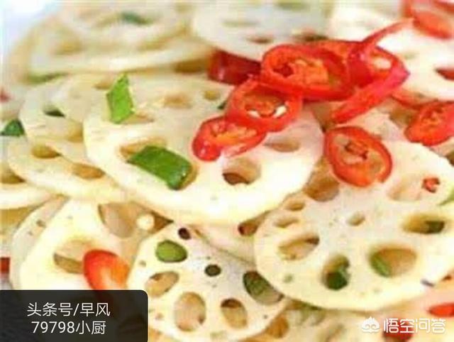 莲藕去皮切块,盐水浸泡五分钟(防转色),捞出,放入开水中焯水两分钟,捞到凉开水中浸冷,捞到盆中,加入香油,葱花,辣椒拌匀即可。