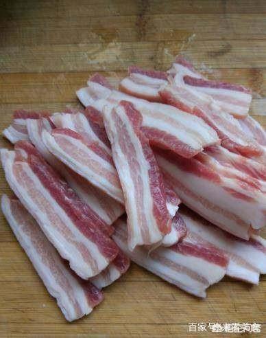 1、把新鲜的五花肉用刀切成大约两到三毫米的肉片。