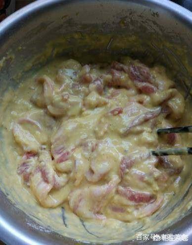 2. 将面粉和淀粉按3:1的比例混合,倒入适量水调成粉浆(能薄薄挂住肉条,不要很厚)。将粉浆倒入肉中,抓匀后加入少许植物油拌匀。