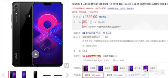 荣耀8X:4+64g 1299元(活动价,目前是送充电宝)