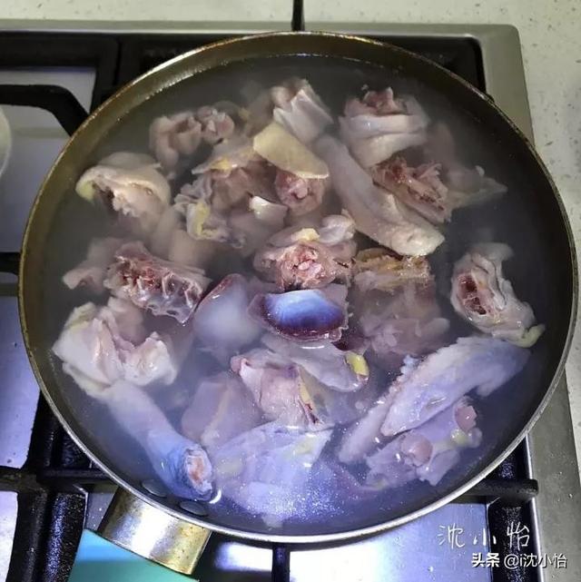 鸡块入冷水,绰烫,入料酒。一定要冷水煮,不然鸡块中血水出不来,容易腥。