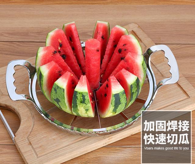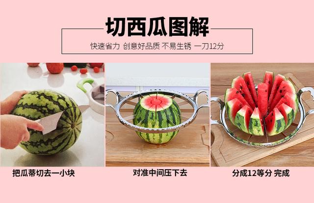 用切割器只需两步走,首先用到切去顶部一小部分,然后拿西瓜切割器对准西瓜后,再用力一按,就能把这个西瓜切割完毕了,而且均等切割,卖相非常好,强烈推荐!