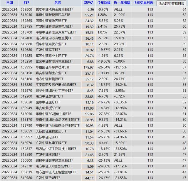 截至20220624,今年共113个交易日,符合网格交易条件的ETF如下:
