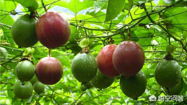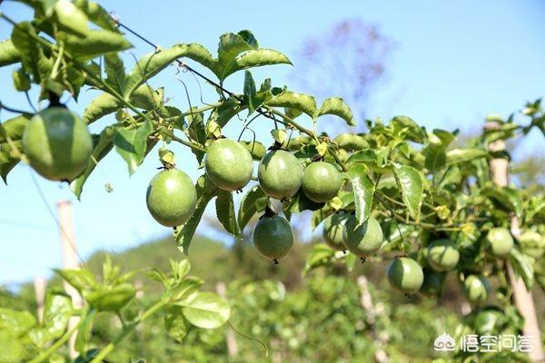 百香果搭架。百香果是一种藤蔓植株,在一定时间会长出强壮的树冠和茂密的枝条,高度可以达到十米。因此需要进行搭架。搭架高度在一点五到两米之间,可以搭成水平棚架,倾斜架,A形架等。搭架可以选用竹竿,木条,水泥柱等,搭架的好处是改善了百香果树通风和光照,也便于植株进行管理。
