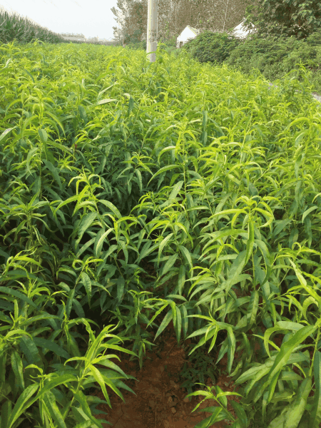 5、插苗移栽。移栽前苗圃要施足基肥,并灌足底水,在水未渗完前将苗木栽入,然后覆土;移栽的株行距为20厘米×50厘米,每亩10000株左右。