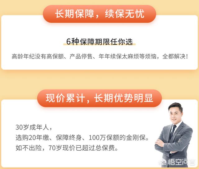 再说说一年期的保险,一年期的医疗险是可以买的,特别是百万医疗,但是百万医疗只能管重病,基本上就是你人快完了的那种大病,这种只是保证了你的财产更少的损失,这种一年期的报销型的保险的钱都是给医院的,注意,只是报销,是实报实销。那么后面如果假设你去医院治疗了之后人没了,那么你在医院的花费有人给你报销,具体多少就看条款了。费用报销了给你的家人,也不影响生活,算是你积德行善了。另外,如果你治疗完了之后人还在,但是丧失了劳动力,这个时候你就是家人的负担了,所以,在这个时候如果有一个提前给付的长险给到你,那你的日子就好多了。