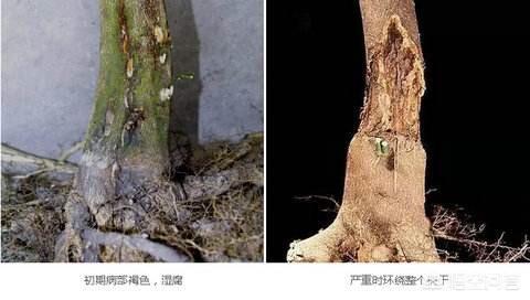 严重时根颈树皮腐烂,露出木质部