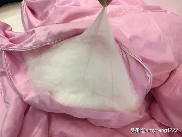 高品质蚕丝的人,生怕你不知道他家蚕丝好,所以教你怎么识别好蚕丝,留着长长的拉链口给你看。品质不好的自然遮遮掩掩,生怕你看见被子中间的丝。留着十几公分的检测口。