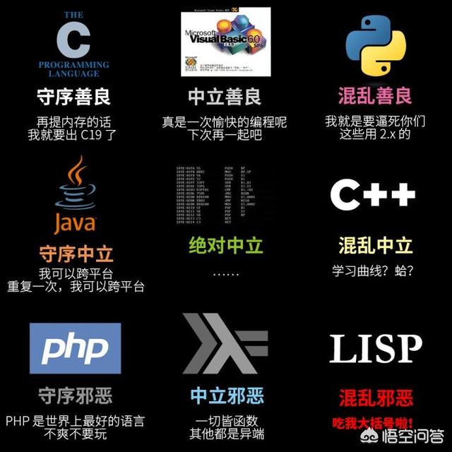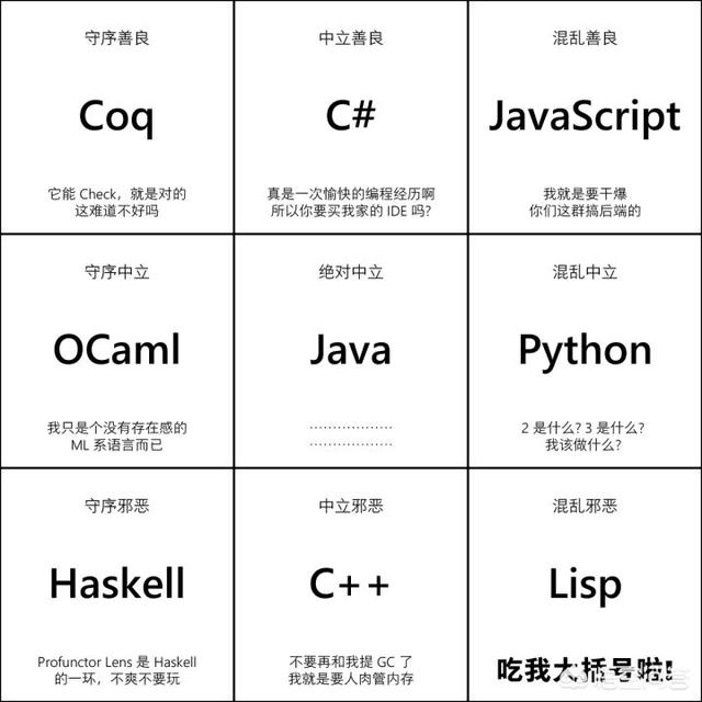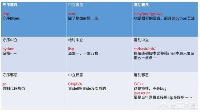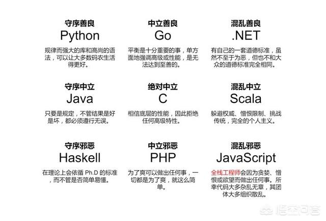 Java一般认为是守序中立,C++大约在混乱中立、中立邪恶到混乱邪恶这一带Python大概是混乱善良到混乱中立,而Lisp的评价呈两极分化状,从守序善良到混乱邪恶都出现过。Haskell的邪恶立场是没跑了,但不知道为什么所有人都认为Go是守序的?