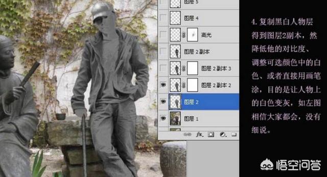 4、复制黑白人物层,得到图层2副本,然后降低他的对比度、调整可选颜色中的白色或者直接用画笔涂抹,目的是让人物上的白色变灰,