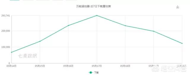说到“互联互通”,什么设备可以具备交互能力?容易想到的是 PC 和手机,可以通过终端控制完成多样家电设备的运行,方便省时。尤其手机,小巧便携,操作空间更灵活,为此诸如万能遥控器一类的 App 慢慢出现在人们视野当中。近期,根据七麦研究院的观察,原本表现平平的万能遥控器突然火了起来,从五月初开始飙升至 App Store 效率类榜单前 5 名,15 日之后更是身居榜首数天,17 日单天下载量破 29 万,气势相当饱满。