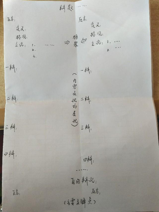 一般准备一张a4纸(图片为格式举例,不是a4),最好能有一个专门的比较大一点儿的笔记本。从中对折,顶端记下辩题,两边分开记录双方内容。