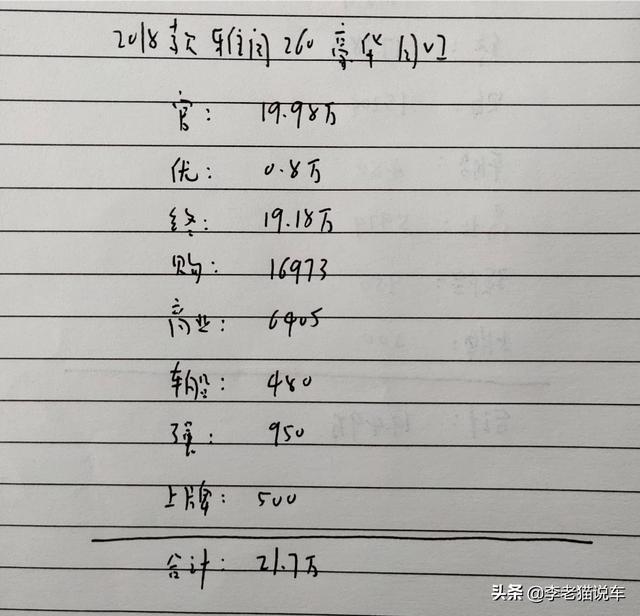 2018款雅阁260豪华国六版,官方指导价19.98万,优惠幅度在0.8万左右,终端裸车成交价19.18万左右,全部落地再加购置税16973,车船税420,强险950,商业险6405,上牌500,共合计21.7万左右。