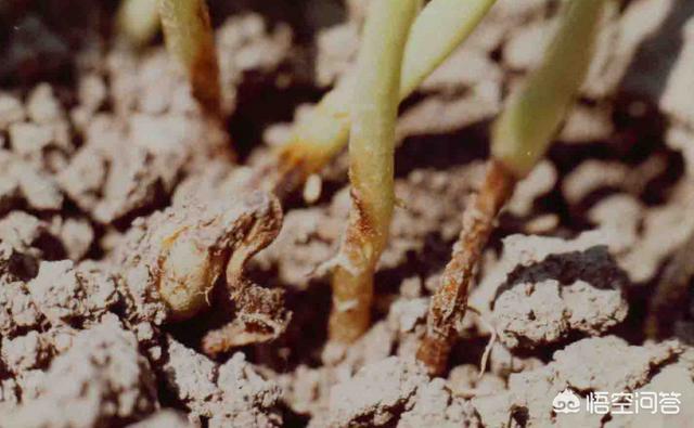 初期茎基部或胚根表皮出现淡红褐色不规则的小斑,后变红褐色凹陷坏死斑,绕根茎扩展致根皮枯死,受害株根系不发达,根瘤少、地上部矮小瘦弱,叶色淡绿,分枝、结荚明显减少。