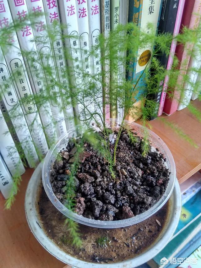 文竹我养几次了,次次死翘翘的,浇水太勤死掉了,晒太阳死翘翘了,不通风死翘翘了。现在不浇水,少晒太阳,多松松土,嗨,冒新芽了。估计这次能养时间长点。总之,文竹盆土喜湿润,但不好控制湿度,多了烂根,不如旱养,一次浇透,盆土干透在浇水。换盆时土湿,不要再浇水了,一浇水准烂根。