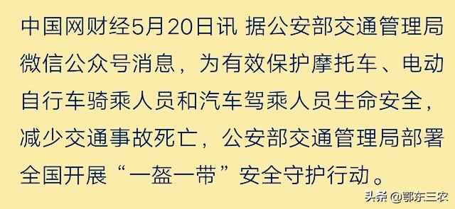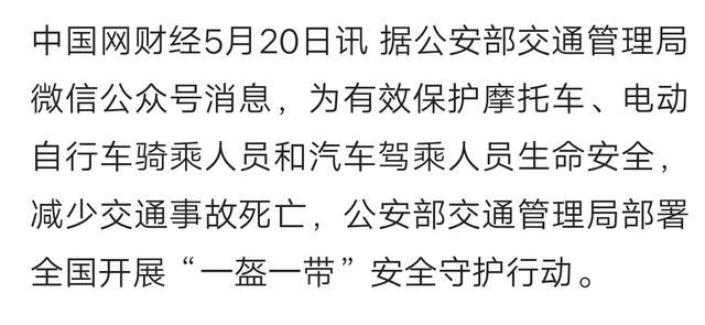 为有效保护摩托车、电动自行车骑乘人员和汽车驾乘人员生命安全,减少交通事故死亡,公安部交通管理局部署全国开展“一盔一带”安全守护行动。