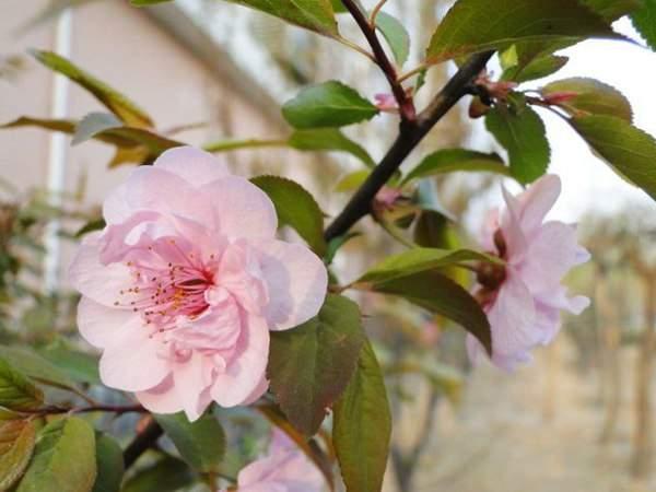 美人梅的花为重瓣,有清香,先花后叶或花叶同放。