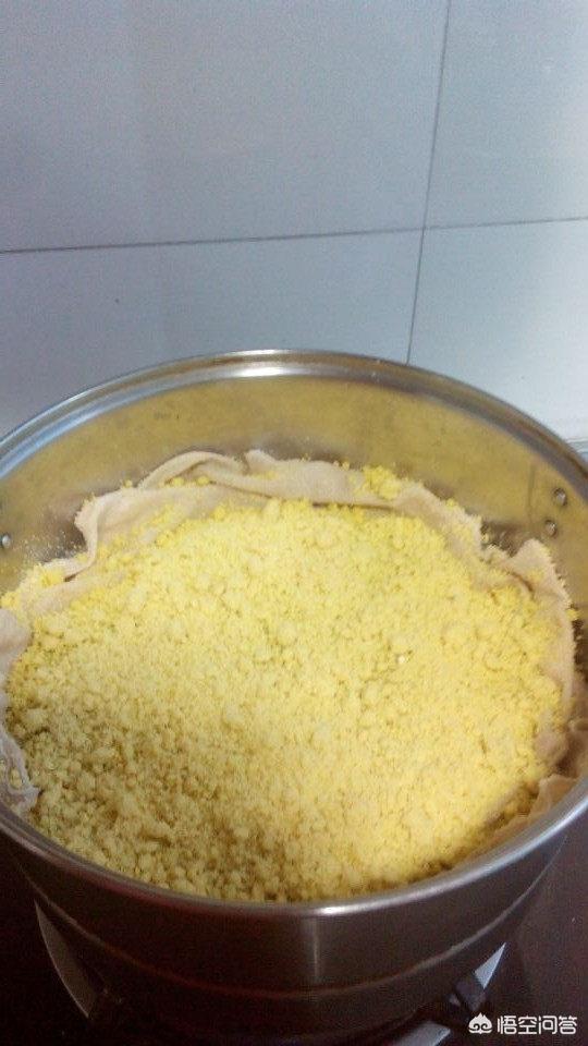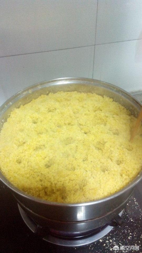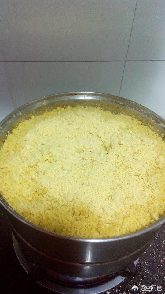 2.倒完水后,用手将黄米面拨开弄散,使黄米面都有水分,不要太干。