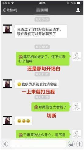 所以我们才要谈恋爱,和女生交往,结婚生子,这样来完成我们想要的生活。不过想要和女生谈恋爱似乎并不容易,越来越的人不会和女生聊天,家庭条件不够好,还不会聊天,女生真的是找不到理由去爱你了。不知道怎么聊?请看以下聊天记录。