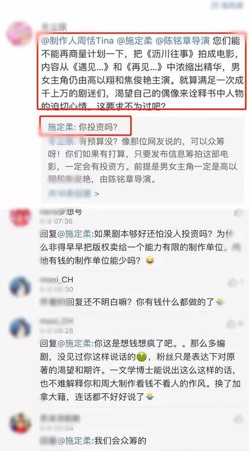 有剧迷提议能不能拍让原班人马拍一个电影《再见王沥川》,导演还是陈铭章,主演还是焦俊艳和高以翔,满足一下千万剧迷,看到原班的沥秋夫妇真的是千万剧迷的心愿,剧迷想拍电影也不为过,但是作者施定柔的回复却令人心寒,直接甩过来四个字:你投资吗?