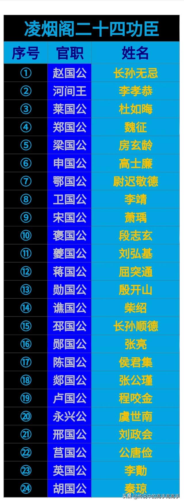 既然说到了凌烟阁功臣,那就很有必要介绍一下,在历史上的凌烟阁二十四功臣。那历史上的二十四位凌烟阁功臣到底都有谁?我做了一张表格