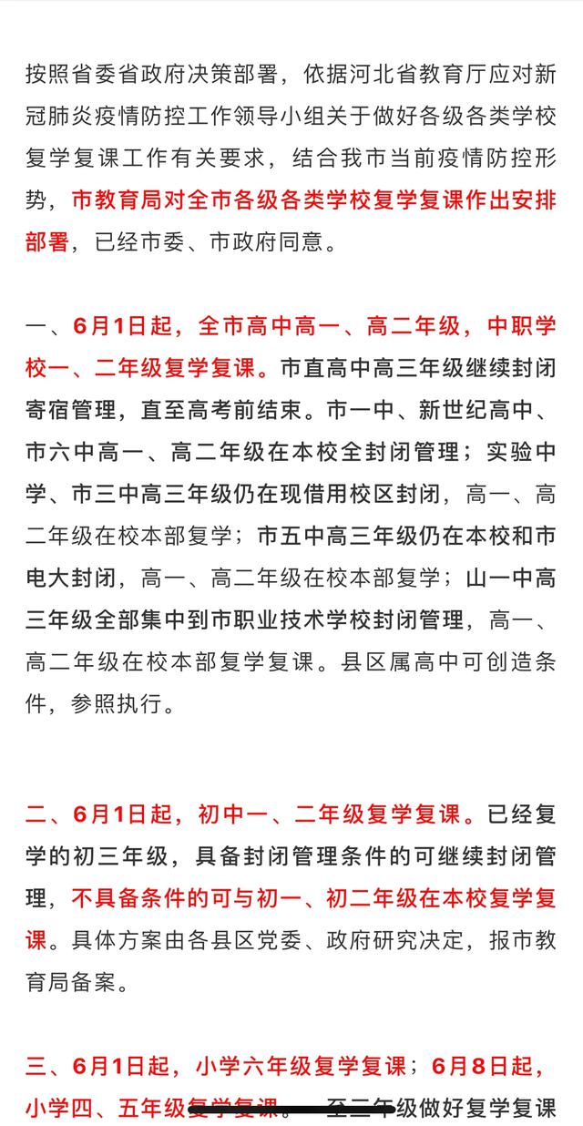 最新消息来了!5月21日,秦皇岛市教育局发布“2020年春季学期秦皇岛市各级各类学校复学复课时间安排”,其中介绍,6月1日起,初中一、二年级复学复课。已经复学的初三年级,具备封闭管理条件的可继续封闭管理,不具备条件的可与初一、初二年级在本校复学复课。具体方案由各县区党委、政府研究决定,报市教育局备案。