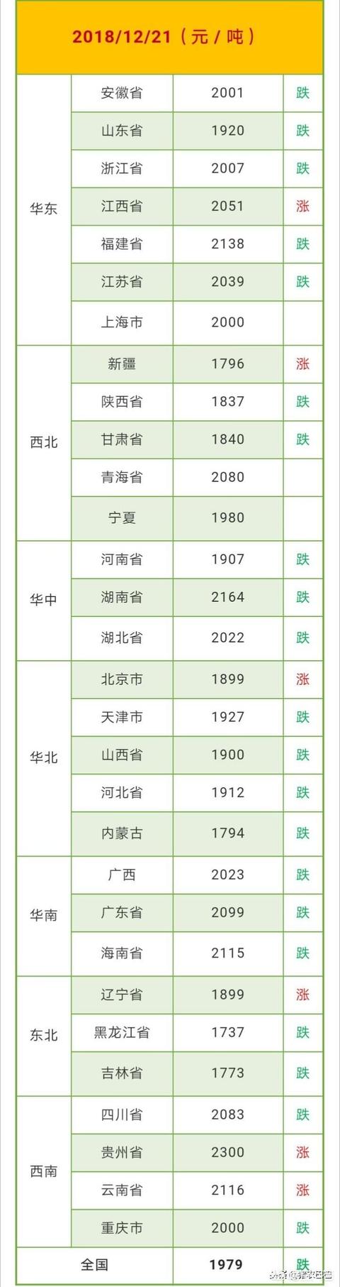 二、再来看看山东及全国的玉米行情情况,当前的山东玉米行情来看,处于一元偏下的位置,大多在0.965-1.015元/斤之间,还有一部分企业仍在1.0元/斤以上。山东地区部分企业下调玉米价格,昌乐英轩周下跌1分,目前价位一点017元/斤;潍坊盛泰药业周下跌1.2分,价格0.988元/斤;邹平西王周下跌2分,价格1.02元/斤;德州福洋下跌1分,价格0.96元/斤。全国玉米价格下跌省份较多,全国平均价格1979元/吨,下面是具体情况,请大家参考: