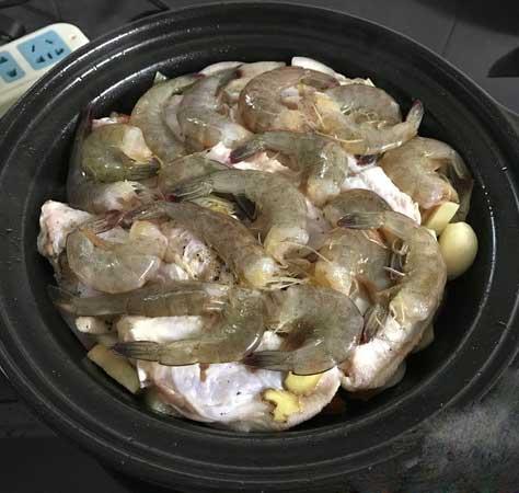(9)加入少许盐翻炒均匀,把鸡翅中放在上面。再把虾放在鸡翅上。