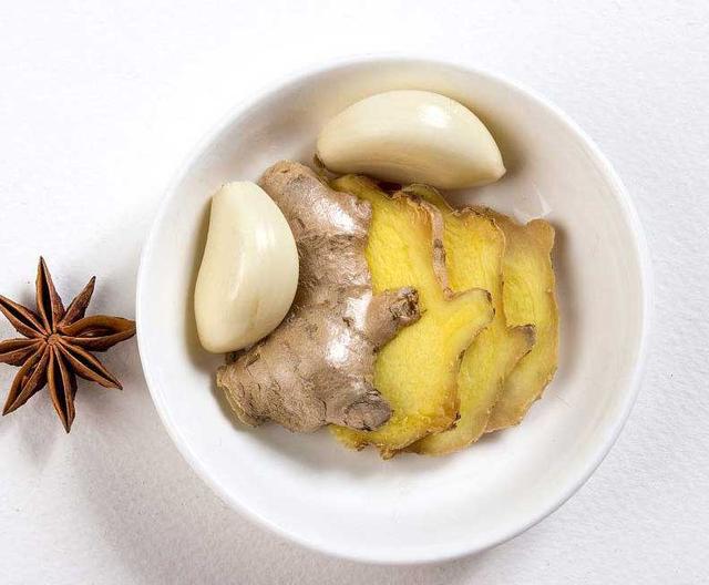 放入姜片和蒜瓣,爆香。