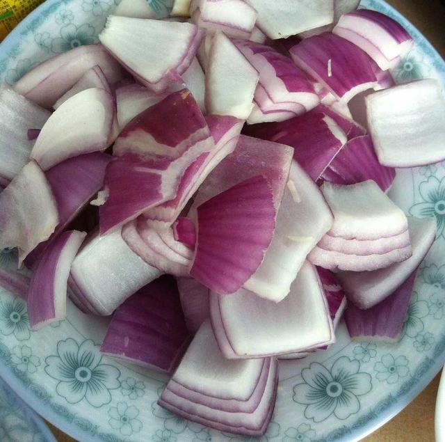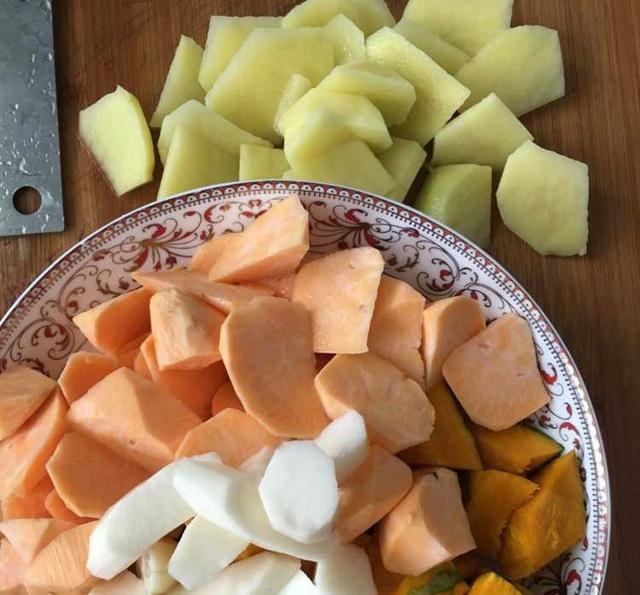 (6)洋葱也切成大块,胡萝卜切成条状。土豆和红薯切块。