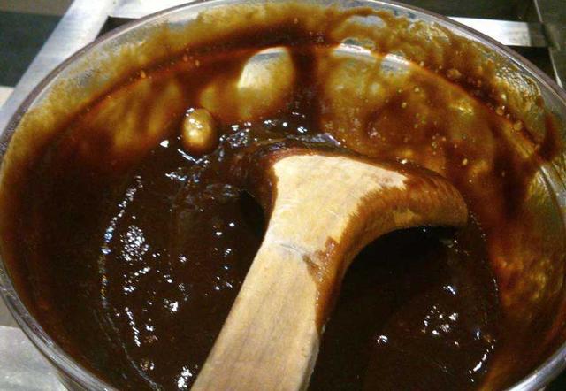 14.开盖后将先前煮好的焖锅酱均匀的倒满一面;