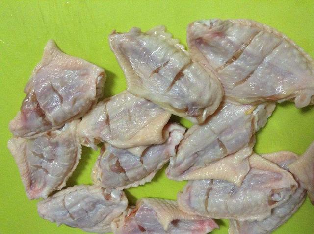 (1)鸡翅中洗净后用刀划2刀。