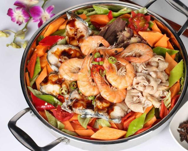 还可以用鱼、虾、牛蛙、肥肠等来做三汁闷锅。