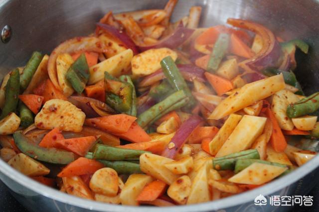(8)先放入洋葱和青红椒翻炒,再把土豆和红薯、胡萝卜放入翻炒下。