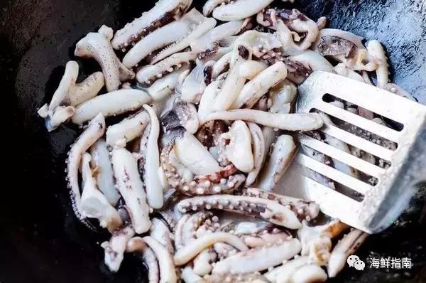 2、炒锅烧热倒进少许油,放进鱿鱼须煸炒出水后盛出备用。