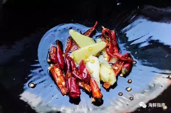 3、另起油锅,放进生姜、红辣椒小火炒香。