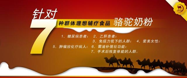 骆驼奶,首先是以其生命力来演绎骆驼奶的营养价值,纯天然、绿色是第一。其次,据有关科学家认为,骆驼奶比牛奶更有益健康,其维生素C的含量是牛奶的三倍,100毫升骆驼奶与等量牛奶的维生素C含量分别为3.8毫克与1.0毫克;骆驼奶中含有类胰岛素因子可以促进胰腺分泌胰岛素。此外,骆驼奶的蛋白质含量与钙含量均高于牛奶,脂肪含量则低于牛奶。除了具有高营养价值以外,还可以辅助治疗糖尿病,同时还可以补铁,属于天然的多功能乳品。据悉,最新的研究表明,每天摄入约一品脱的骆驼奶,可以有效降低血液中葡萄糖水平,减少人体对于胰岛素的需求量。相关人士指出,骆驼奶可以用于糖尿病的治疗。骆驼奶含有类胰岛素因子可以辅助降糖。