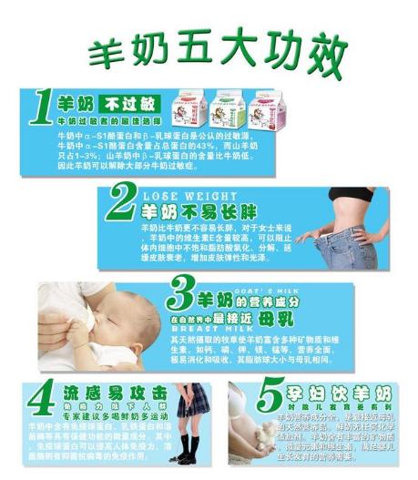 羊奶在国际界被称为“奶中之王”,羊奶的脂肪颗粒体积为牛奶的三分之一,更利于人体吸收,并且长期饮用羊奶不会引起发胖。羊奶中的维生素及微量元素明显高于牛奶,美国、欧洲的部分国家均把羊奶视为营养佳品,欧洲鲜羊奶的售价是牛奶的9倍。专家建议患有过敏症、胃肠疾病、支气管炎症或身体虚弱的人群以及婴儿更适宜饮用。