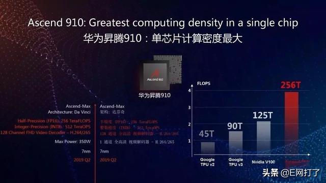 昇腾910被华为称为“目前全球已发布的单芯片计算密度最大的AI芯片”,主要用于边缘计算产品上,这表明华为将准备在人工智能的未来产业中占据技术标准的高地,主导技术标准的制定。