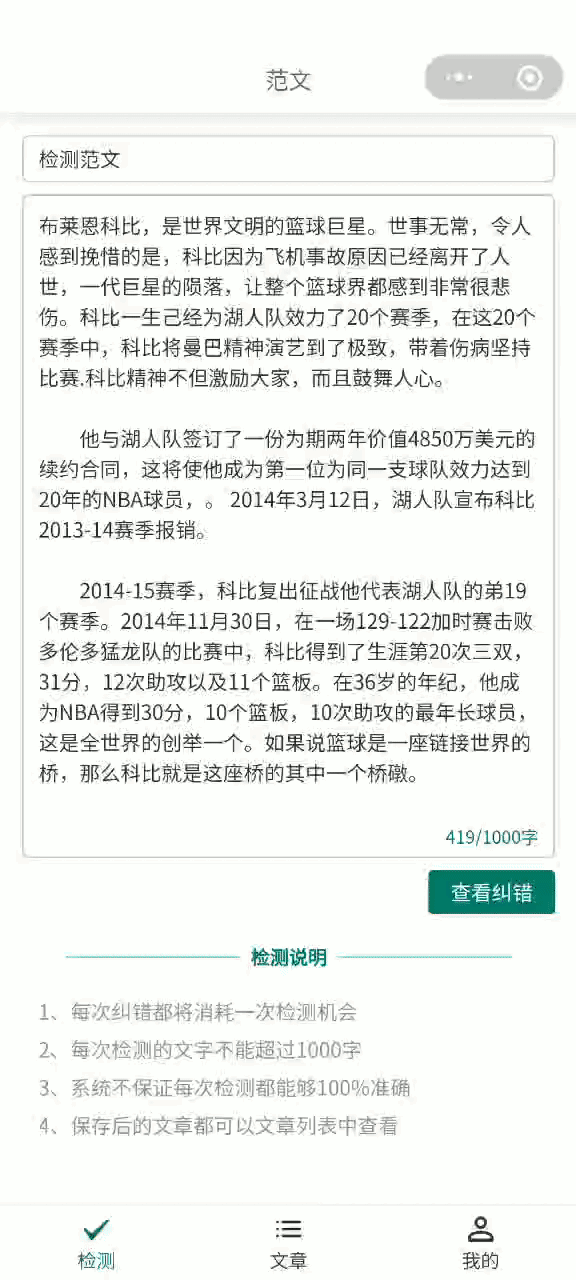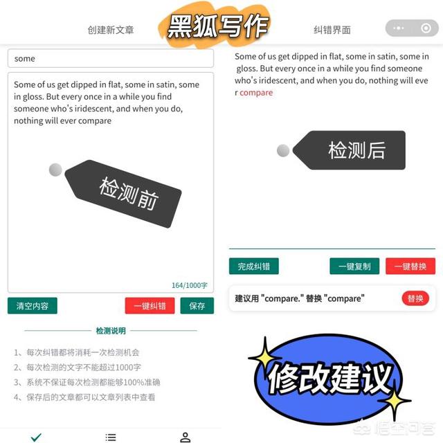 iPad的话,我还是喜欢用小程序比较多,像“黑狐写作”就很方便,它的主要功能是进行错别字检测识别,然后一键纠正错别字。细心的是,它还会提供相对应的修改建议,还会用不同的字体颜色标记出来呢,让我们快速找到并及时修改。