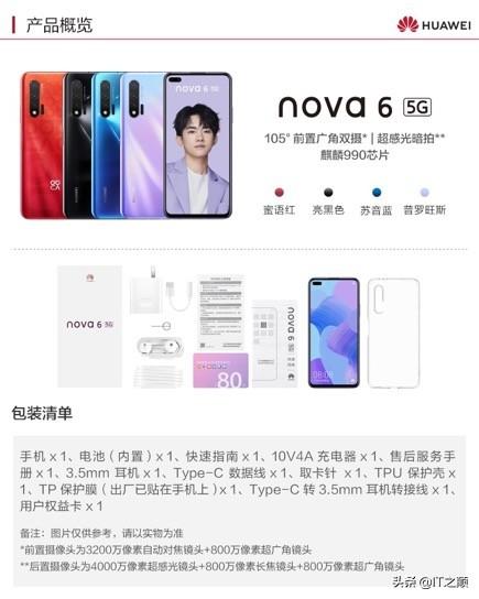 再说一下nova6 5G,nova6 5G虽然上市时间较早,但是是第一款搭载麒麟990的机器,续航方面:4200毫安电池和40w快充组合能够符合上续航的标准,4000万像素后摄,3200万像素前置主摄像头+IMX616索尼传感器,支持自动对焦,自拍效果同样出色。