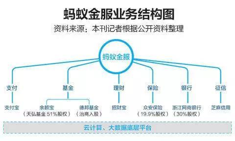 蚂蚁金融服务集团起步于2004年成立的支付宝。2013年3月,支付宝的母公司——浙江阿里巴巴电子商务有限公司,宣布将以其为主体筹建小微金融服务集团,小微金融(筹)成为蚂蚁金服的前身。2014年10月,蚂蚁金服正式成立。目前,蚂蚁金服旗下有支付宝、余额宝、招财宝、蚂蚁聚宝、网商银行、蚂蚁花呗、芝麻信用、蚂蚁金融云、蚂蚁达客等子业务板块。介绍完蚂蚁金服的基本情况之后,看下蚂蚁金服的主要业务与股权结构,了解阿里巴巴与蚂蚁金服的关系。
