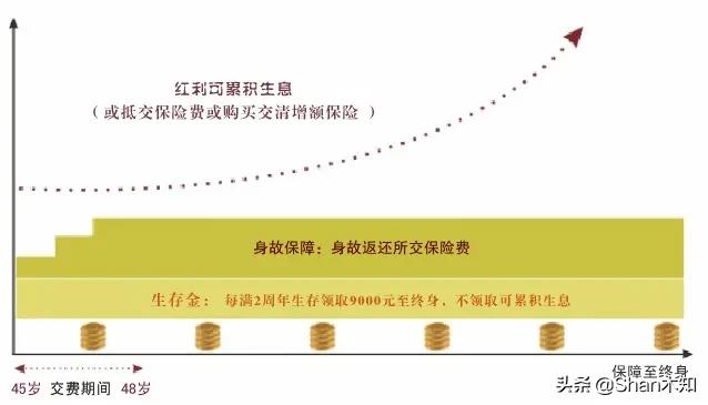 两全保险兼具有“储蓄性”和“保障性”两项功能,既是一种资产储备也是一份风险保障。任何一份两全保险的合同中都有一个载明的到期日,到期之前,两全保险的职责是“保障”,到期之后,它的职责就是一次性拿出一笔“生存保险金”。