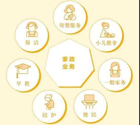 家政包括母婴服务(月嫂、育婴师、催乳师等)、小儿推拿、陪护(老人、医院)、一般家务(清洁打扫、接送孩子、家庭餐制作等等)、保洁、早教、便民等内容。