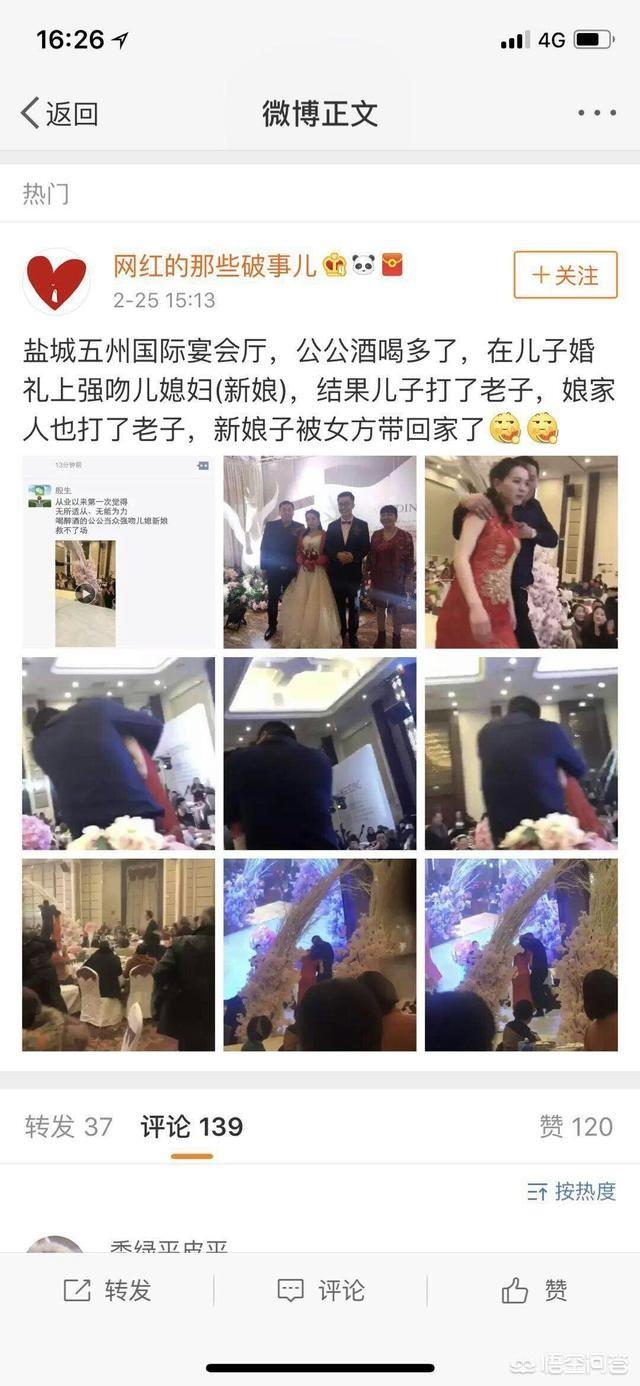 这个是真的发生在盐城,当事人已经开直播解释了整个事件,说gg当时只是亲了新娘的脸颊,娘家人也没有带走新娘,儿子也没有打老子。不知道这是他们当地的习俗还是GG就是借着酒劲占便宜。从这件事可以看出这个GG也不是什么好人,老实本分的人干不出来。听说这个新娘是老师以后怎么去面对学生,为人师表。结婚本来就是很高兴的事情,过度的闹喜就伤风败俗了。