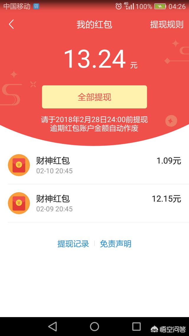第一天的红包雨抢了1.15元,第二天拼手气红包雨抢了13.08,总体来说感觉不错,比百万英雄答题来的快,参加百万英雄赢了10次,平均下来每赢一场奖金才5元左右,而如果算上未通关的场次,平均参与一场只能得几毛钱吧。