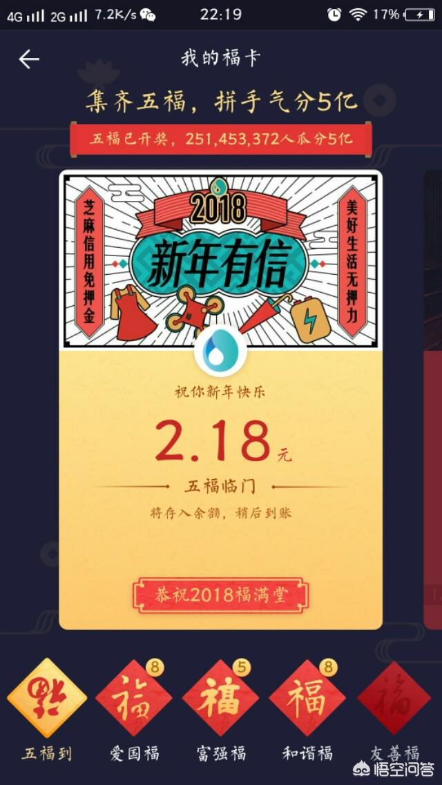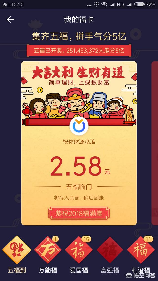 你们集齐了支付宝的五福之后,获得了多少钱哪??