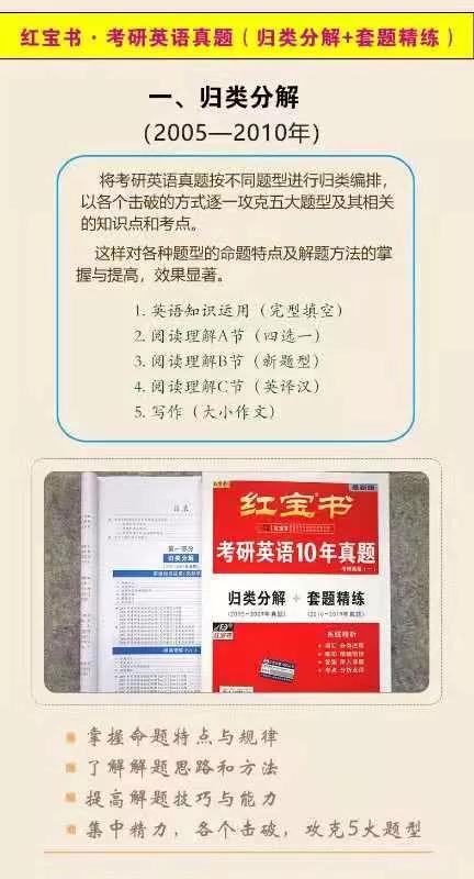 - 《红宝书考研英语10年真题》 遵循由简单到复杂、从局部到整体的原则,先分类突破,再整合提高。里面对于 长难句 和 语法 解析的很全面,也很到位。是一个非常严谨的资料,尤其是设计相当合理。通过科学、合理、高效地使用真题,全面提升应试能力。