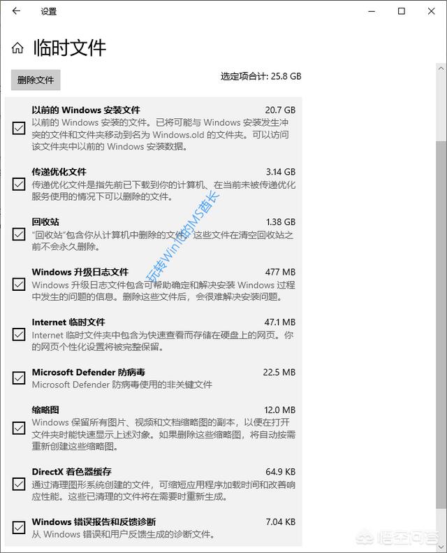 你可以看到“以前的Windows安装、传递优化文件、回收站”占用的空间都是数以G计的,另外其他的临时文件占用的空间也不可小视。