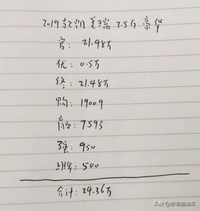 价格方面,2019款凯美瑞2.5g豪华版,官方指导价21.98万,优惠幅度在0.5万左右,终端裸车成交价21.48万左右,全部落地再加购置税19009,车船税720,强险950,商业险7593,上牌500,共合计24.36万左右。